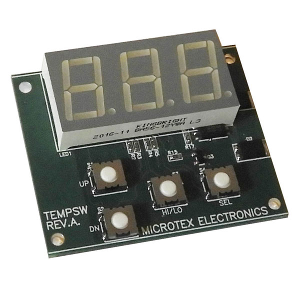 Thermostat board with temperature & humidity sensors, with buttons for setting values for the switch to turn on and off, includes a 3-digit 7-segment LED display